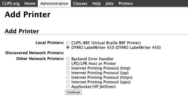 At this point, you must attached the dymo device to the usb port. So when you open up after that the admin portal. Within the Administration you now see your Label Writer 450 just select this and hit "continue"